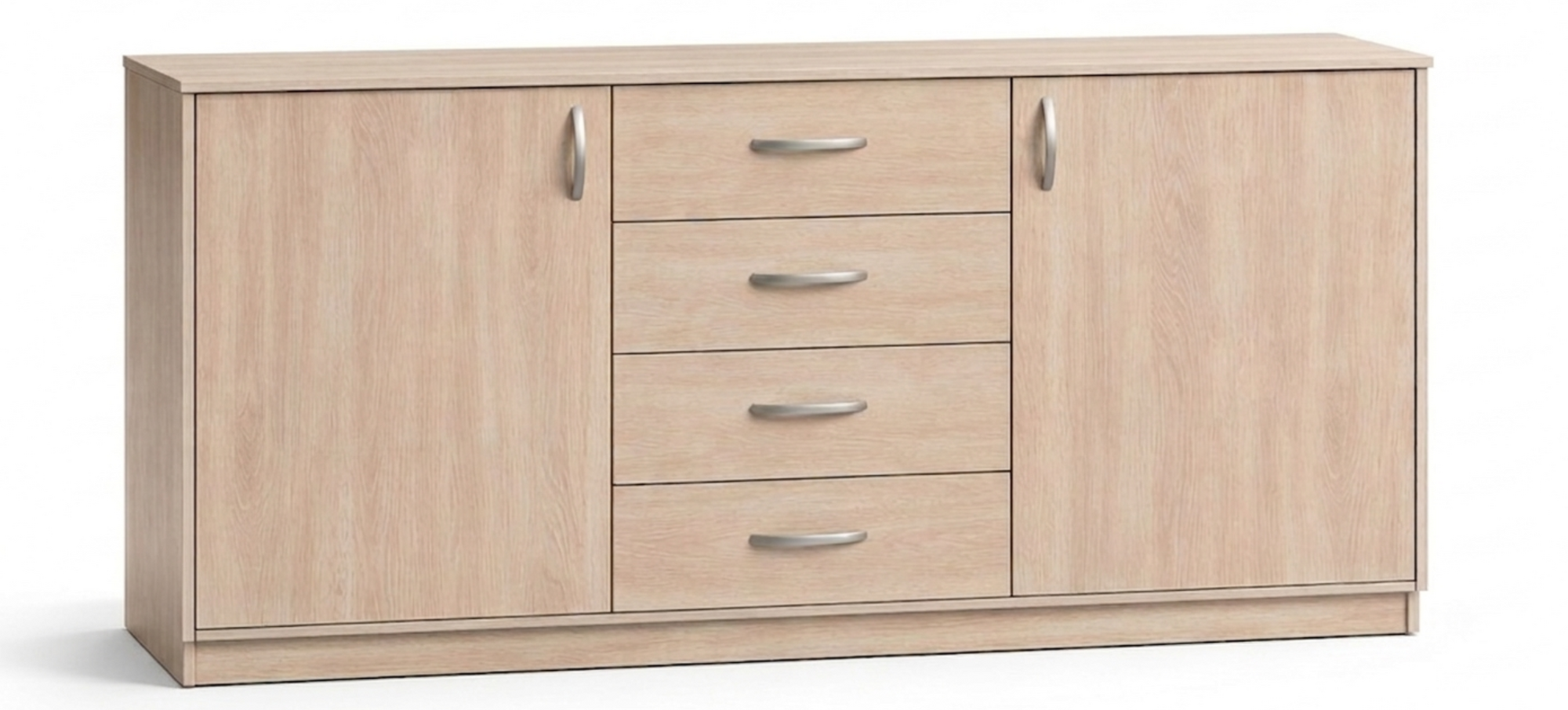 4 drawers in the centre, one hinged door on the right and left, 2 shelves behind each drawer
