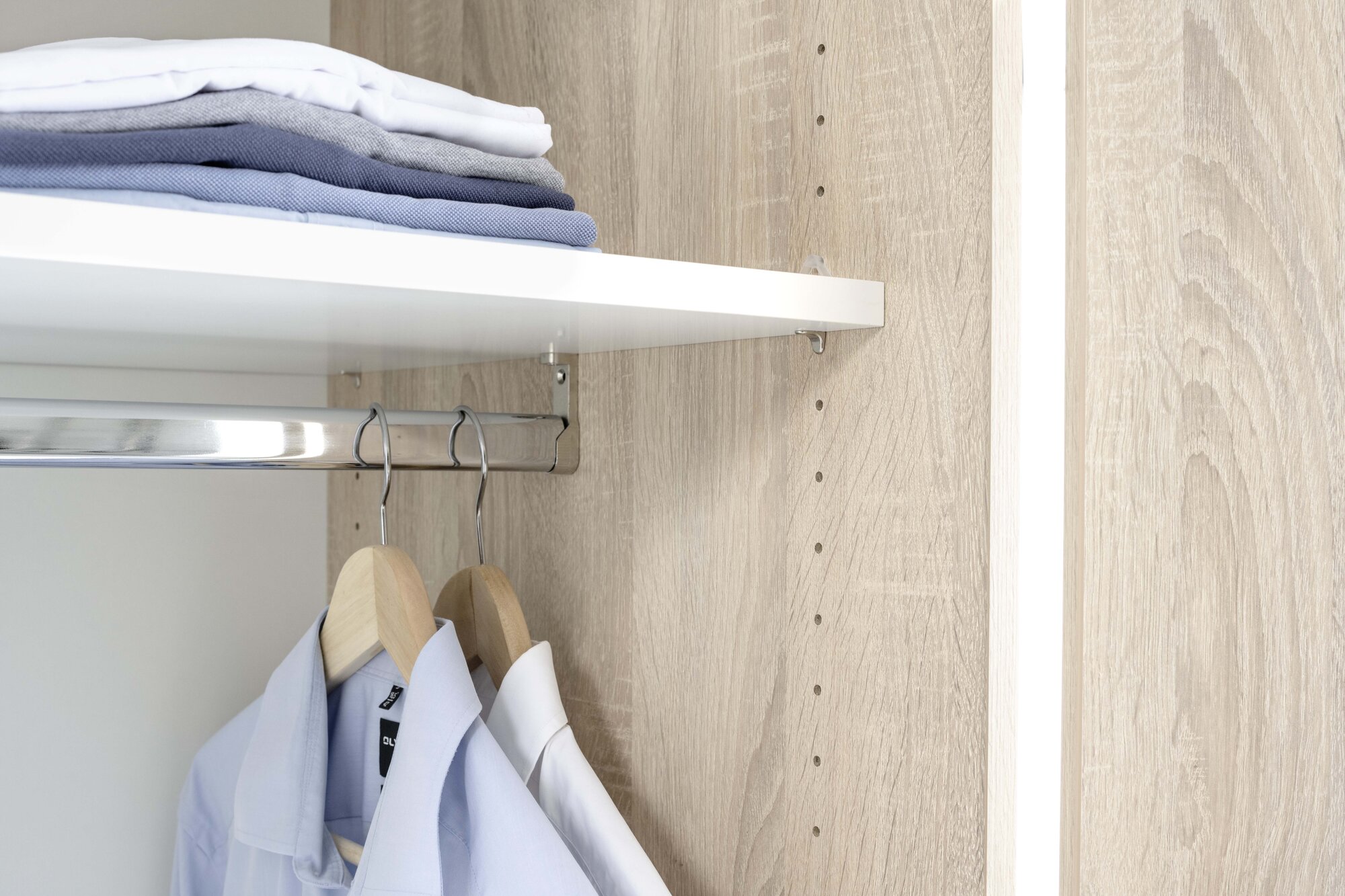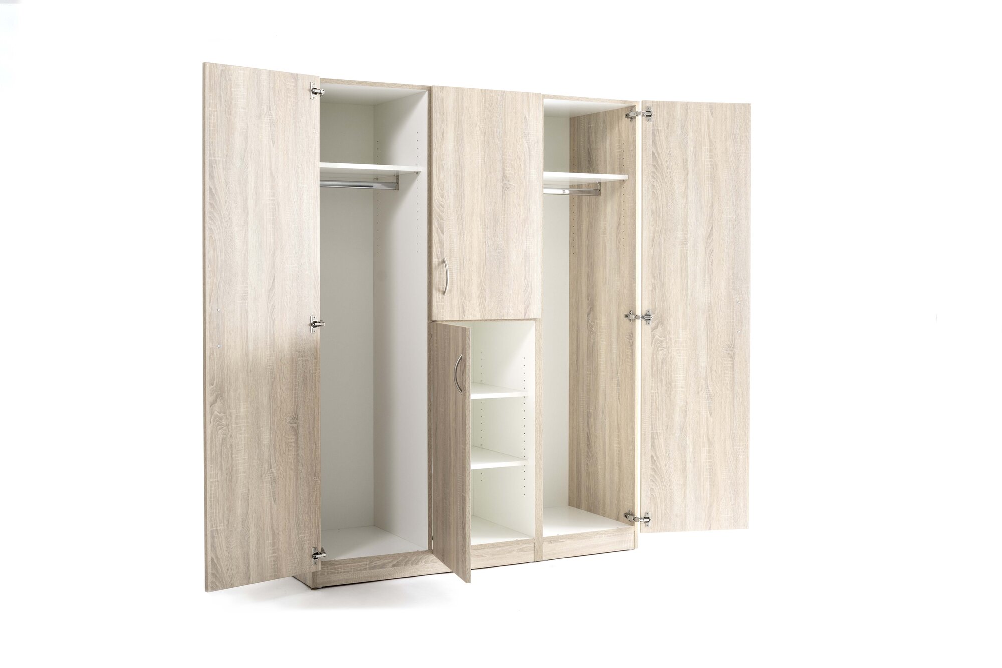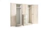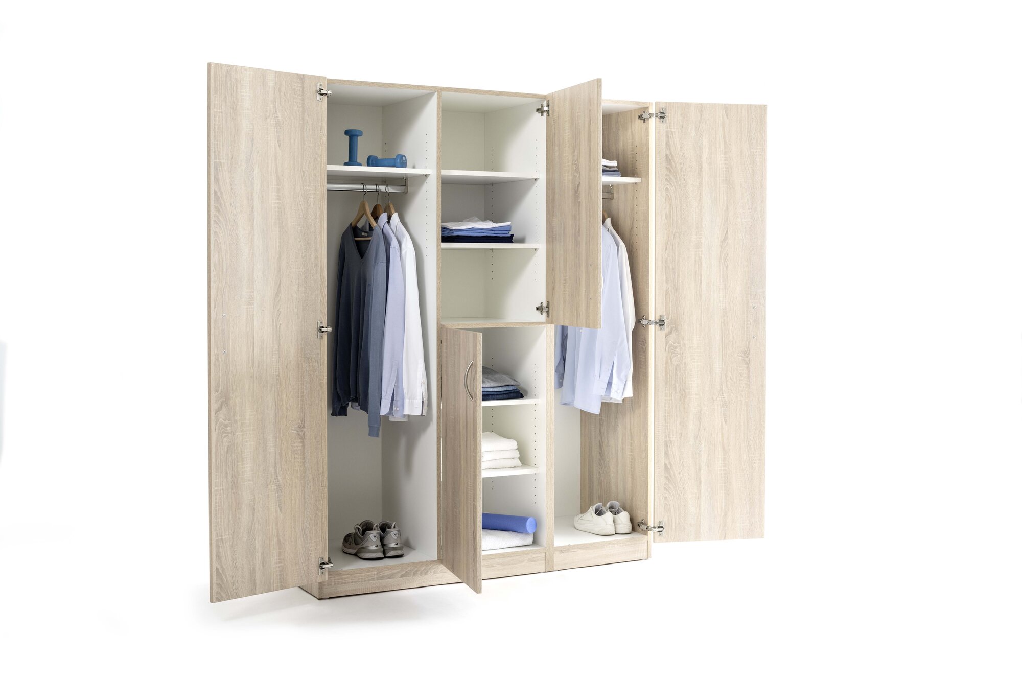 4 hinged doors: 1 hinged door on the right and 1 hinged door on the left behind 1 hat shelf and 1 clothes rail (oval tube),