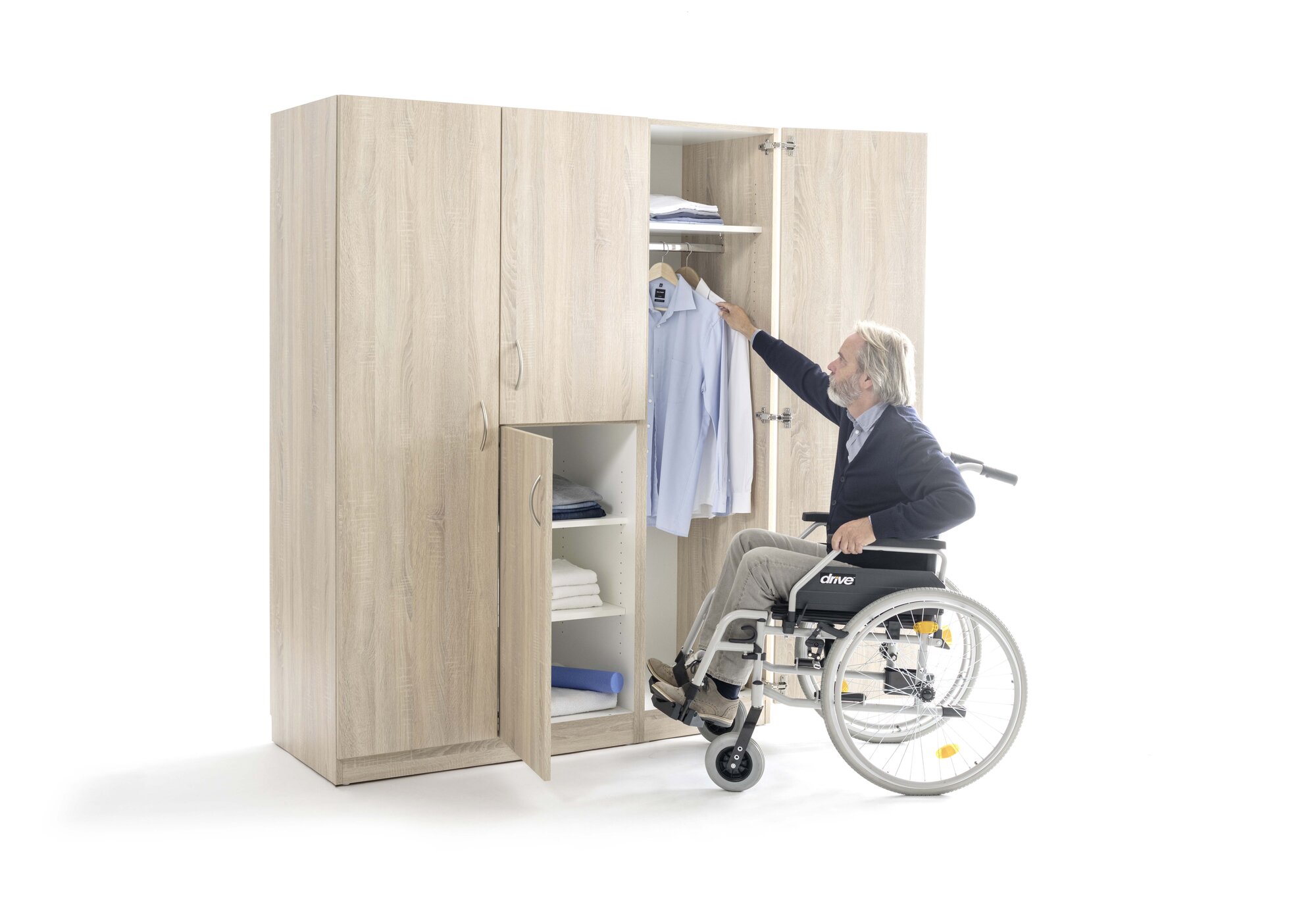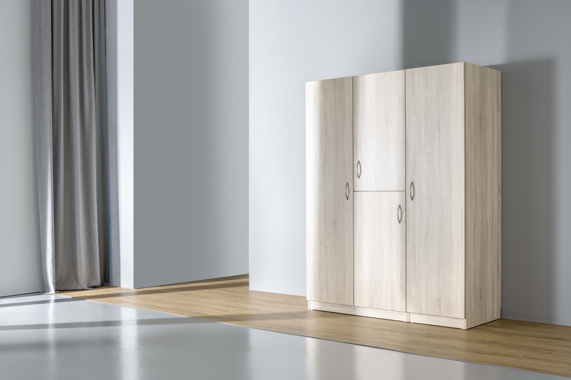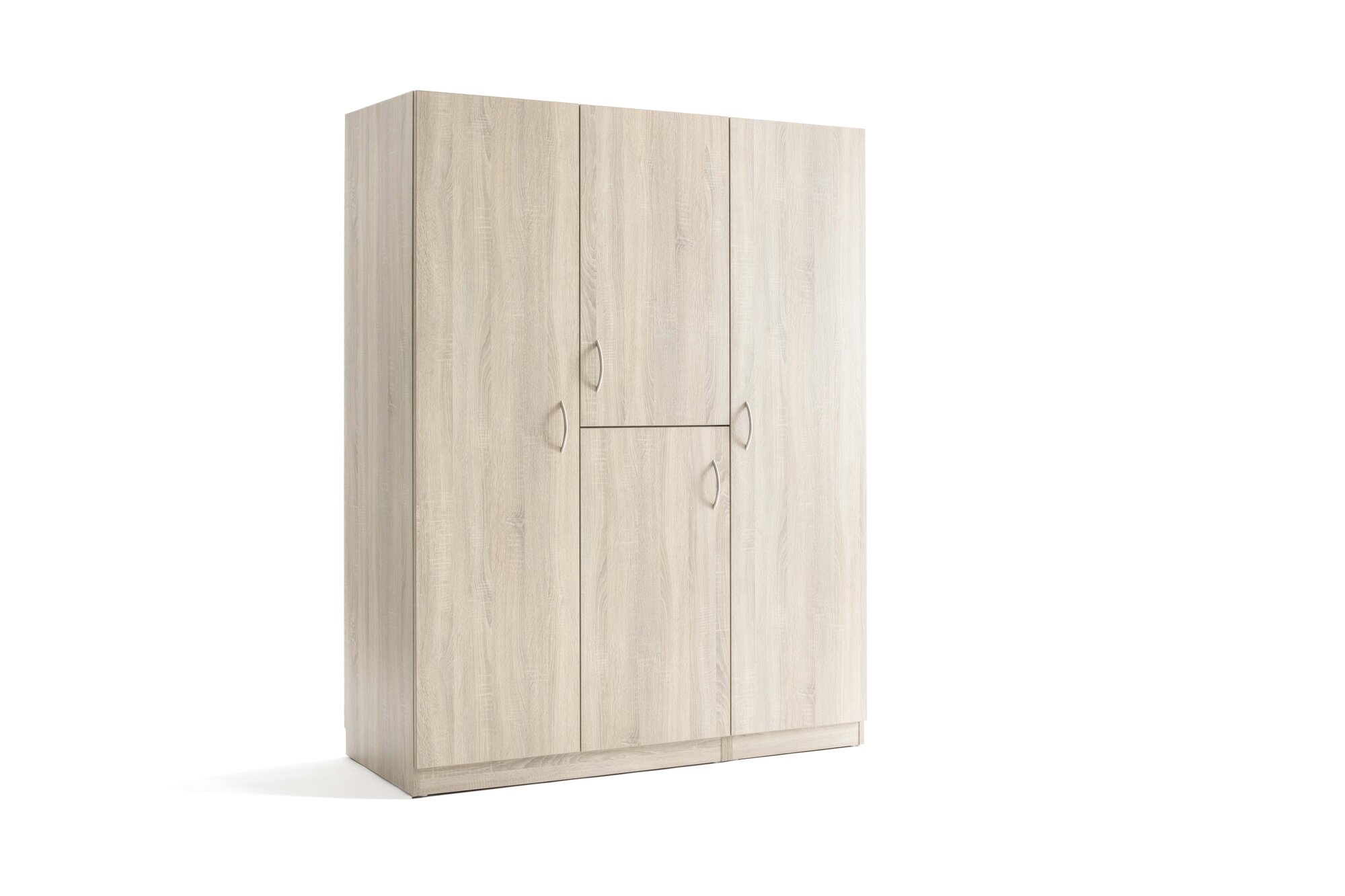 4 hinged doors: 1 hinged door on the right and 1 hinged door on the left behind 1 hat shelf and 1 clothes rail (oval tube),